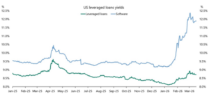 The “SaaS apocalypse” fears also weighed heavily on the software lending market. As the chart below depicts, yields on loans to software companies have spiked in recent weeks. Default fears on such loans held by private credit funds (often totaling 20–30% of their assets) have precipitated a record level of redemption requests, forcing the funds to “gate” their liquidity.