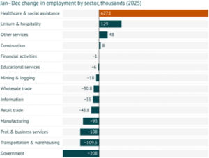 GDP rose at a seasonally and inflation-adjusted annual rate of just 0.5% in the fourth quarter, hampered by a record-long government shutdown that saw government spending tumble. For the full year, GDP posted a 2.1% increase. In 2024, the economy rose at a 2.8% pace. The Atlanta Fed’s GDPNow model forecast for Q1 real GDP growth is 1.3%.