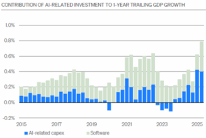 This “slow to hire, slow to fire” dynamic has created a two-tier labor market. Workers who already have jobs enjoy relative stability and steady incomes, supporting consumer spending and resilient GDP. Those looking for work, however, face dwindling opportunities and longer job searches, particularly as AI has begun to replace human labor.