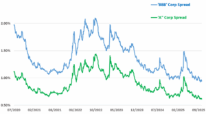 Credit spreads on investment-grade corporate bonds are now at their lowest levels since 1998. Notably, two Microsoft bonds maturing in 2027 are trading at lower yields than Treasurys of the same maturity!