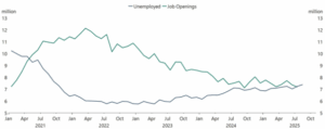 Amid restrictive immigration policies, the foreign-born workforce has dropped by 1.2 million in just six months. As a result, the labor force has stagnated, as a low 4.3% headline unemployment rate masks deeper weakness. For job seekers, conditions have clearly worsened and are more constrained. There are now 7.4 million unemployed Americans and only 7.2 million job openings—a reversal from the post-pandemic years when openings far exceeded jobless numbers. Long-term unemployment is the highest in over three years, increasingly affecting college-educated workers.